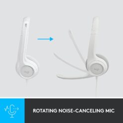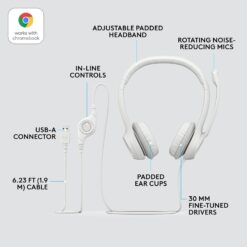 The Logitech H390 Headset in White combines professional audio performance with sleek aesthetics for modern workspaces. This USB headset features a noise-reducing microphone that delivers crystal-clear voice quality for calls, meetings, and recordings. The adjustable headband and plush leatherette ear cushions provide exceptional comfort during extended wear, while the convenient in-line controls allow quick adjustments to volume and mute settings.