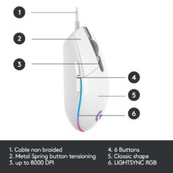 The Logitech G203 HERO LightSync is a high-performance RGB gaming mouse that combines precision, speed, and style. Designed with advanced optical tracking and customizable LightSync RGB lighting, this sleek white mouse delivers a vibrant gaming experience. Its 8,000 DPI sensor ensures ultra-precise cursor movement, while the ergonomic shape fits comfortably in hand for extended gaming sessions. Plug-and-play USB connectivity and wide compatibility with laptops and PCs make it a go-to choice for gamers who want reliability and flair in one package.