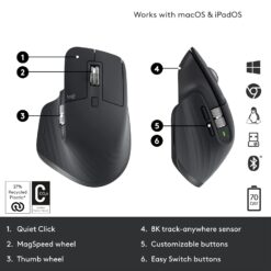 The Logitech MX Master 3S is a premium wireless mouse designed for ultimate productivity and precision. With an advanced 8000 DPI optical sensor and silent click technology, it offers ultra-responsive performance with reduced noise. Its ergonomic design ensures comfortable use for long hours, while the MagSpeed Electromagnetic scroll wheel delivers fast, precise scrolling. Featuring Bluetooth and USB-C fast charging, the MX Master 3S works seamlessly across Windows, macOS, Linux, and iPadOS. Ideal for multitaskers and professionals, it supports multi-device control and app-specific customizations for a truly next-level workflow.
